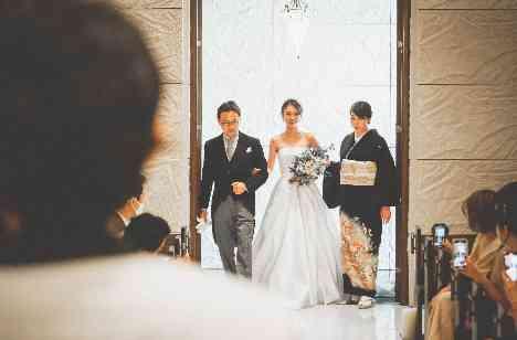 新郎新婦入場の前に、親御様への感謝を伝えた映像を上映し、まずは新郎様が入場。 お父様お母様にバージンロードを通って迎えに行って頂き、 最後のお支度ジャケット・ブートニアセレモニー後 背中を押してもらい、お一人でバージンロードを堂々と進みました。 新婦様の入場はお父様お母様と3人で。祭壇前にお父様から新郎様にバトンタッチされ、ご家族との思いも溢れた時間となりました。