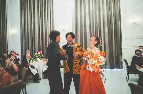 実は双子のお兄様がいる新郎様。 ゲストのみんなを驚かせたい!と、再入場では新郎様に扮したお兄様と入場しました! 瓜二つなお兄様だったので、ゲストの皆様も全く気がついておらず、、、、 「ちょっと待ったー!」とW階段から現れた新郎様に全員がびっくり!!!! 驚きと笑顔あふれる再入場となりました!