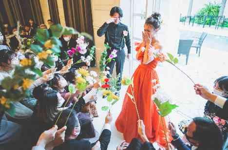 新婦様に内緒でサプライズを考えていた新郎様。 新婦様が中座した後、ご友人にもお手伝い頂いて、ゲスト全員にお花を配りました。 そのお花は、おふたりが最後退場をする際に ゲスト全員から新婦様にサプライズでプレゼント。 70名ものおふたりにとって大切な人たちが一同に花を届けるシーンは スタッフ全員も感動するような、素敵なシーンとなりました。
