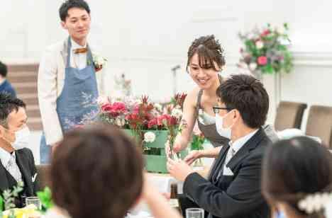 新婦様の小さい頃の夢は「お花屋さんになること」そんな新婦様の夢を叶えたフラワービュッフェはゲスト皆様とお話をしながら楽しめる時間に!ひとつひとつのテーブルを周りながらお花をテーブルに飾り会場をアレンジしました。この日だけの新婦様のお花屋さんがOPENしたオリジナルの演出はゲストの記憶に残るお時間になりました。