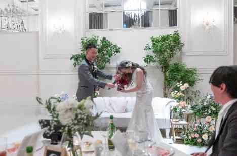 大階段でのアフターセレモニーのフラワーシャワーもワンちゃんと一緒に過ごしたおふたり。ゲスト皆様に囲まれながら「おめでとう」の祝福の声が大階段に広がりました。パーティースタートはグラスを高く上げ披露宴がスタート!乾杯とともにおふたりの元へゲストがたくさん集まりグラスとグラスを合わせて楽しいお時間が始まりました。