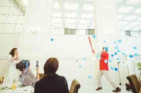 パーティーではおふたりの入場のタイミングで「始球式」をおこないました。ユニホームを着てバットを持った新郎様とグローブをはめた新婦様が登場。ゲスト皆様の目の前で新婦様がバルーンボールを投球!新郎様が大きくバットを振ると中から可愛らしい小さなハートがいっぱい飛び出してプレイボール♡楽しいパーティーがスタートしました。