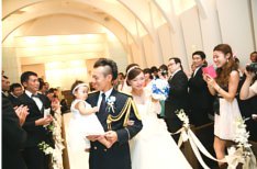 結婚式の退場シーンは家族3人で退場!!これからの人生を考えて、家族3人で退場を選びました。ゲストの皆様からのサプライズのスタンディングオベーションは家族3人、一生忘れる事の出来ない想い出になりました。お父さんとバージンロードを歩いて、子供と退場出来るのはパパママの結婚式だからこそ叶える事の出来る演出だと思います。
