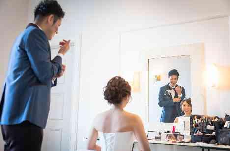 ハワイで挙式を挙げられたおふたり。 ウェディングドレスとタキシードのファーストミートはハワイで行ったのでパーティのお支度はおふたり同じお部屋で。 二人の時間も会話の絶えない楽しいおふたりはとてもリラックスしたご様子でした。