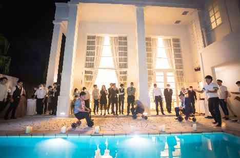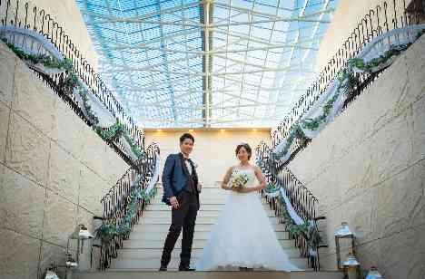パーティ前には2人でゆっくりとした時間をお過ごしいただきました。全天候型の大階段はル・グラン・ミラージュで花嫁様に大人気の場所。夕暮れの空の下、まるで前撮りのようなお写真を残しました。お二人もとっても楽しそうに、お写真撮影を楽しんでいらっしゃいました。