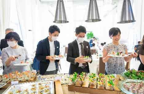 「お越しくださる大切なゲストの皆様に安心して思いきり楽しんで欲しい」 そんなおふたりの想いをしっかり届けるために、ゲストの皆様には事前に 感染拡大防止対策の動画をお送りしたり、結婚式当日はミニアルコールスプレーやマスク等が入ったウェルカムバッグを全員に用意。ビュッフェスタイルのお料理では、トングの使い回しが無いよう、ピンチョスや小皿でのお料理を用意しながら、マイトングも用意しました。
