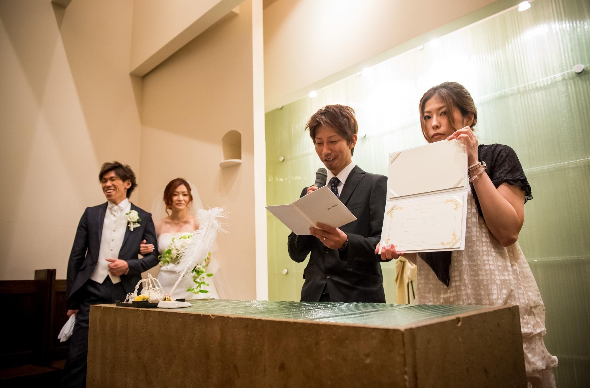 人前式、というスタイルを選ばれたおふたり。結婚式にお招きした大切なゲストの皆様の中から選ばれた代表のご友人2名には挙式の中で承認の署名と証人宣言をして頂きました。ゲスト参加型の挙式はアットホームな雰囲気となり一体感のあるワンシーンとなりました。