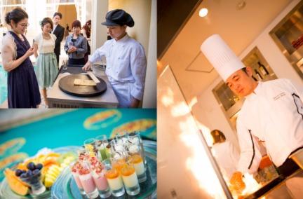 結婚式の楽しみはなんといってもお料理。オープンキッチンの併設された披露宴会場はただお料理を出すだけで絵になります。迫力満点のシェフによるフランベショーや、趣向を凝らしたお料理の数々。最後のデザートはブッフェスタイルでご用意。ゲストの皆様と笑顔を交わしながらのガーデンパーティとなりました。パティシエが目の前で焼いてくれるクレープも大人気でした!