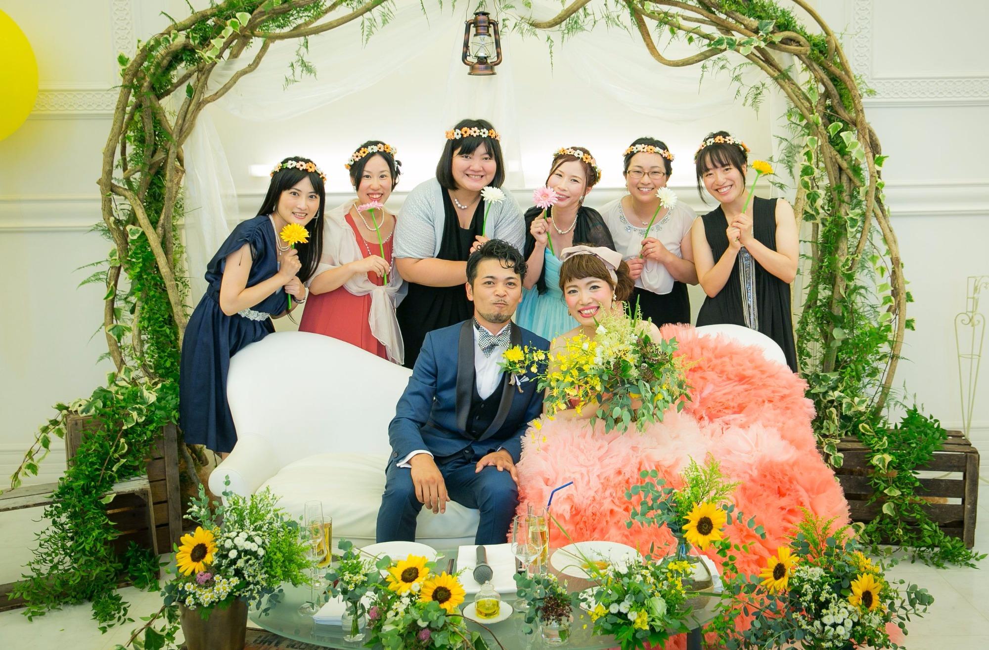 おふたりがこだわったのは会場内の雰囲気作り。 ビタミンカラーのイエローをテーマカラーに、夏らしくひまわりとグリーンを基調としたコーディネートに。 ソファ席はゲストの方もお写真が撮りやすく大好評に。