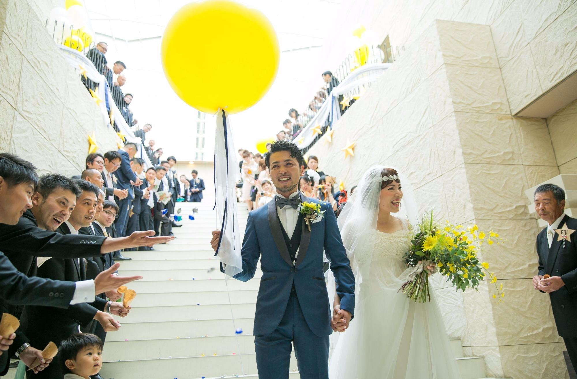 挙式はチャペルで厳かに。 明るく開放的な大階段にはイエローの星をあしらい、おふたりにご用意していただいた小さな星をたくさんゲストの方にお配りしてスターシャワーを。