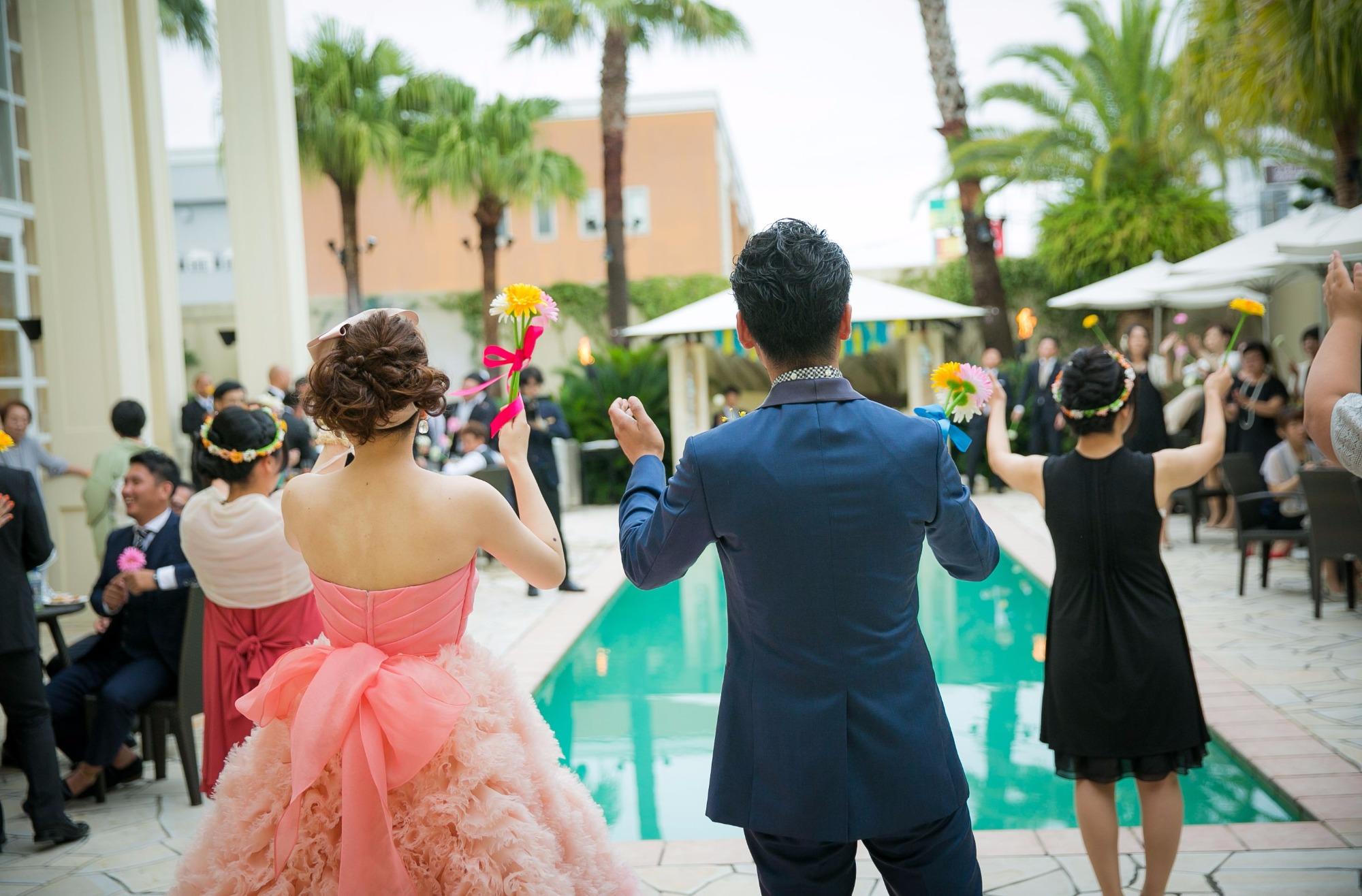 おふたりのこだわりの一つガーデンパーティは、夏らしいガーデンクリルBBQをゲストの皆様に満喫して頂いた後、新婦様のご友人からのご余興のシーンを。 ご友人の皆様が企画してくださったのはゲスト参加型のダンス余興!夏らしいお花をゲストの皆様に1本ずつお配りしたら簡単な振り付けを練習!曲に合わせての本番は一体感がありとても盛り上がるガーデンでのワンシーンとなりました。