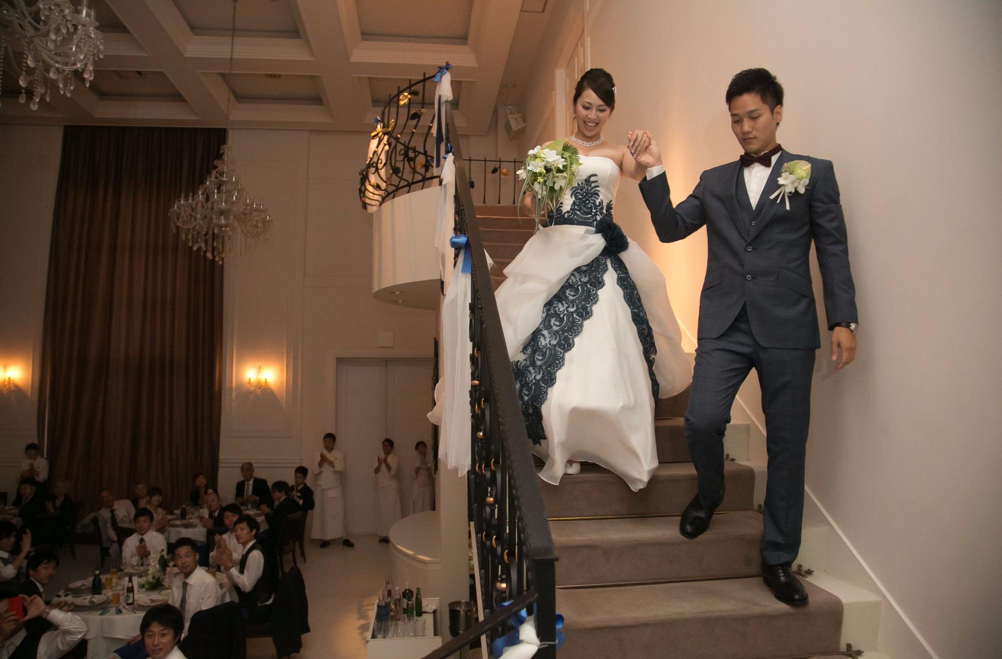 ガーデンでの明るい挙式の後は会場内でしっとりとした良い雰囲気を演出。登場するだけで盛り上がる階段からの入場シーンは、入場した瞬間も階段を下りている間も絵になる素敵なシーンに。 どのお席からでも素敵なお写真の撮れるフォトジェニックな空間です。