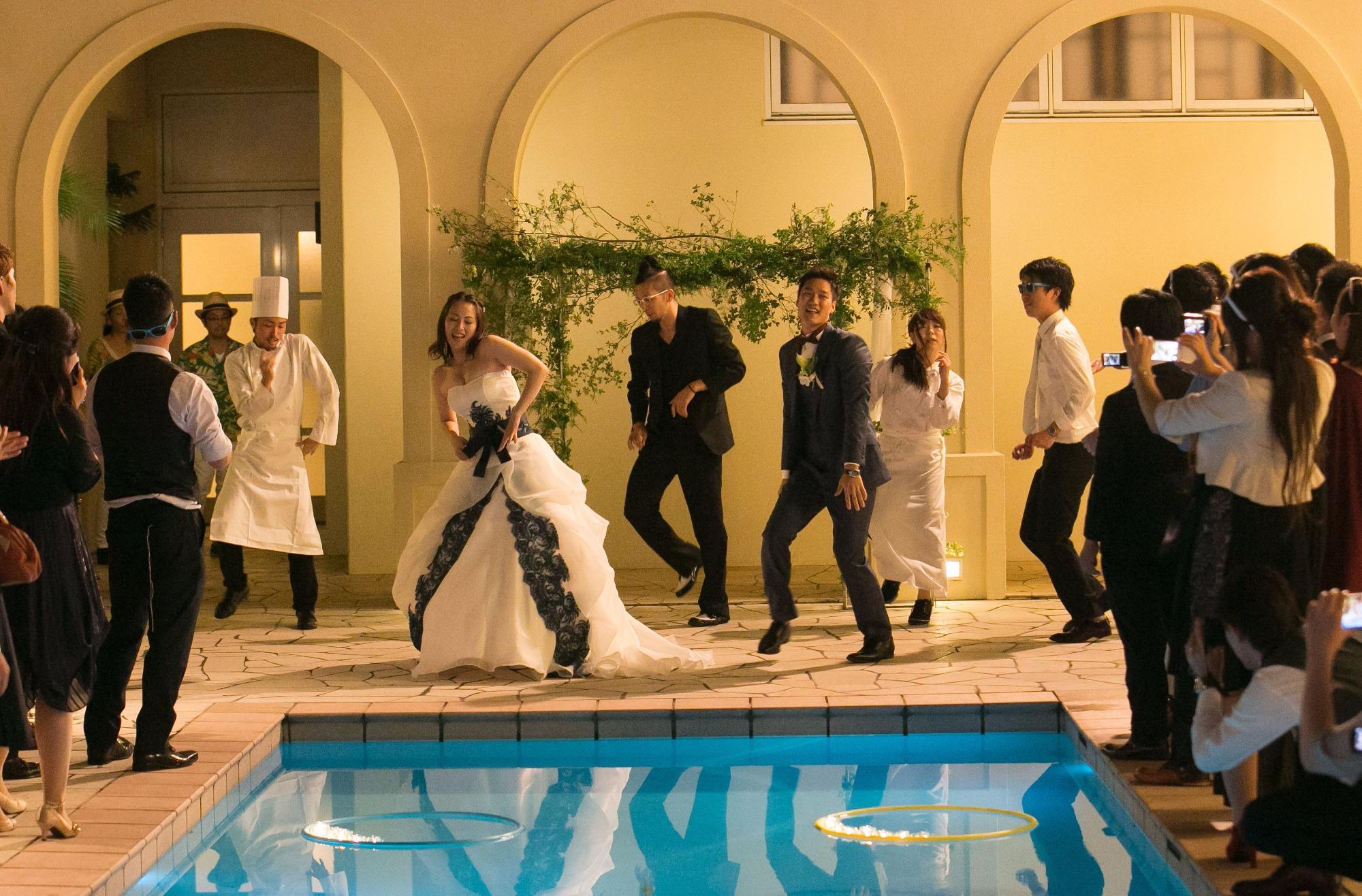 クライマックスの演出としておふたりが選ばれたのは、ガーデンでのフラッシュモブ!集合写真の撮影が終わるとカメラマンが急に踊り出し、ゲストはびっくり!思わず見入っていると途中からおふたりもダンスに参加!何か月もダンスレッスンに通ったおふたりのダンスにガーデンは歓声に包まれました。