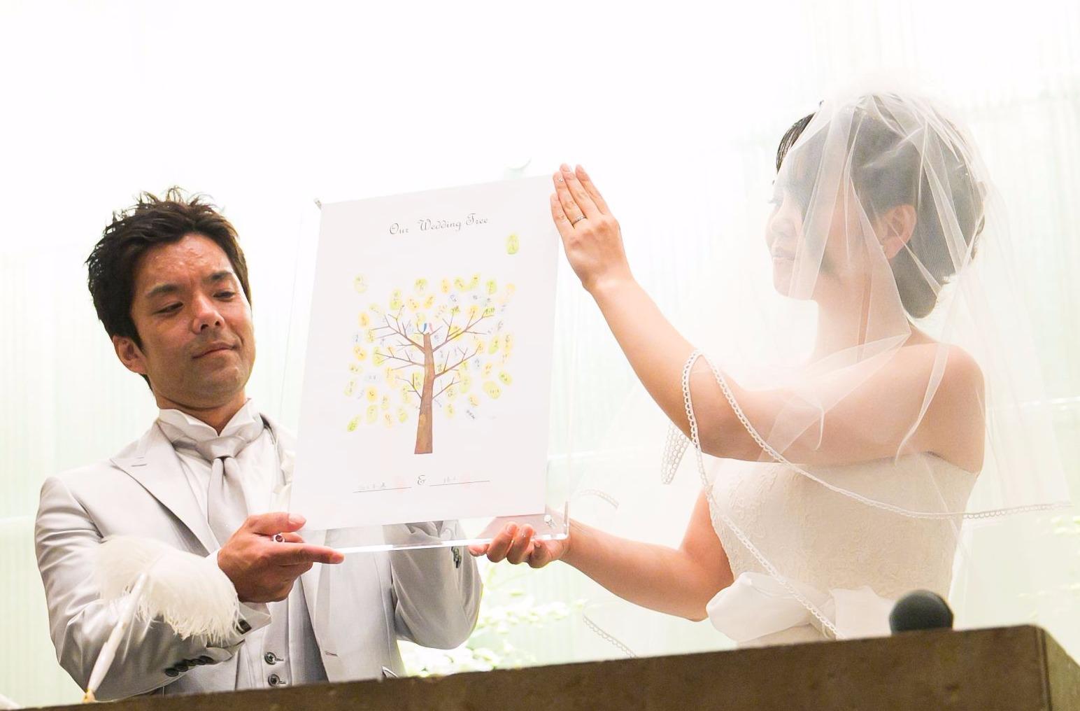 挙式はゲストの皆様の前で永遠の愛を誓う人前式。 承認の証に捺印と署名を頂く、ウエディングツリーをセレクト。二部制の一部と二部の間の時間に挙式を設定し、両方のゲストに見届けて頂けるよう進行を組みました。