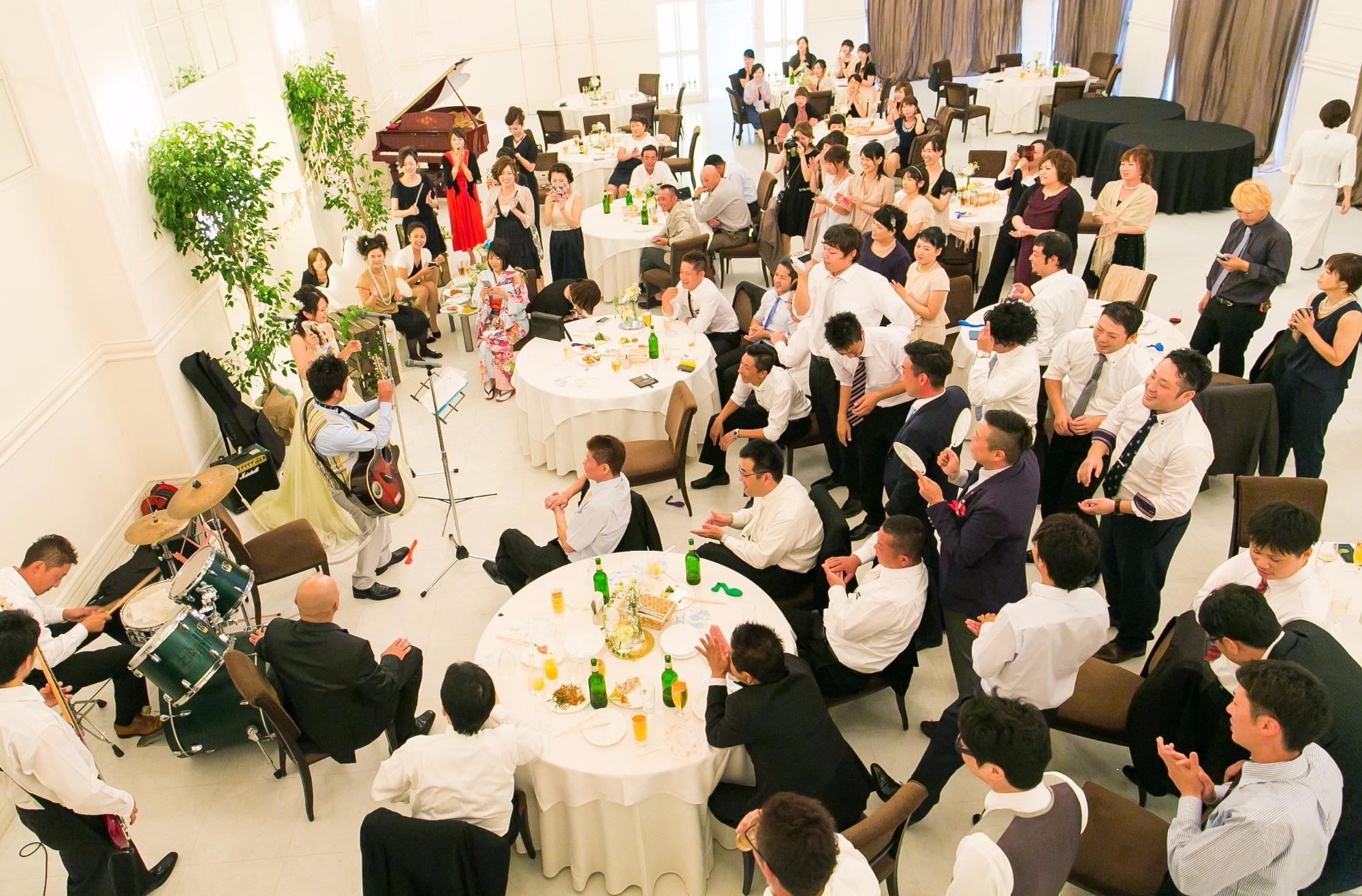 2部のメインはおふたりも参加のバンド演奏!会場の熱気も急上昇です! ご友人の方だけだからこそのカジュアルな盛り上がり方、でも二次会とは違う演出としてのおもてなし感も計算されたワンシーンでした。