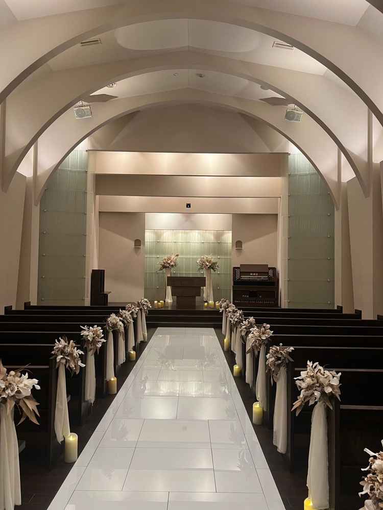 温かみのあるチャペルに音響と照明機器が備わっていて、暗くなるとまた全然違う雰囲気になり、映像を流せることができるのが魅力でした。