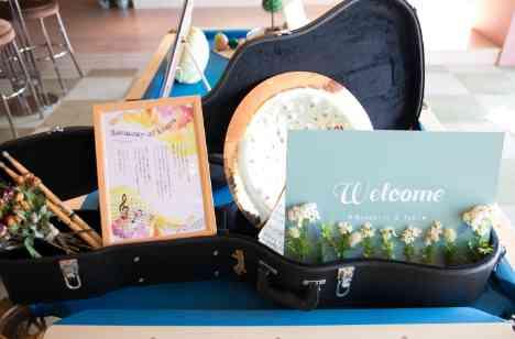 ウエルカムルームでは1人1人に手紙を用意し、それを見るだけで泣いてくれる友人も! ウエルカムディスプレイは、おふたりからのメッセージやギターケースでコーディネート。プランナーの「コンセプトボード」も一緒に。