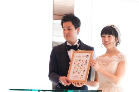 挙式は人前式。 新郎新婦手作りの、テーマに合わせた音符のウエディングツリー。 ゲストみんなにスタンプしてもらってふたりの宝物に。 ベールダウンではプランナーがお母さまにかけた「(新婦)家の娘としての最後の言葉をかけてください・・・」のことばでお母さまも涙腺崩壊。