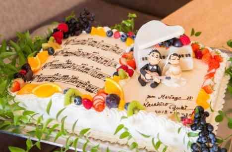 会場コーデにもギターを飾って。メインテーブルはゲストが集まりやすいソファースタイルを選択。 ウエディングケーキも楽譜をイメージし新婦曰く「めちゃめちゃ可愛い!」。 デザートブッフェにも音符をあしらいました。