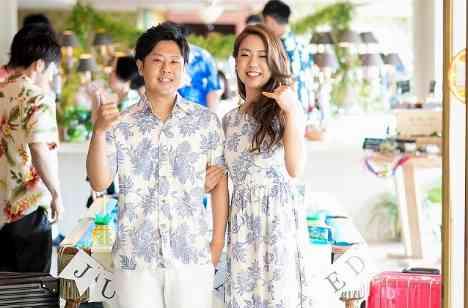 ハワイで挙式したおふたり。 ウエルカムルームでのお迎えもお揃いの「アロハシャツ&ムームー」。 エスコートカードの「アロハシャツ」をゲストも着替えて結婚式! パーティ会場も陽光に包まれて、ナチュラルな雰囲気にハワイテイストを加えてコーディネート。