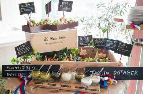 ウエルカムフードのPOPは栄養士である新婦の手書きでユニークにおもてなし。 元々料理にこだわる会場だからこそ、今回は使う食材からこだわって、さらに食材解説付きという、今までない料理提案&コースとなりました。