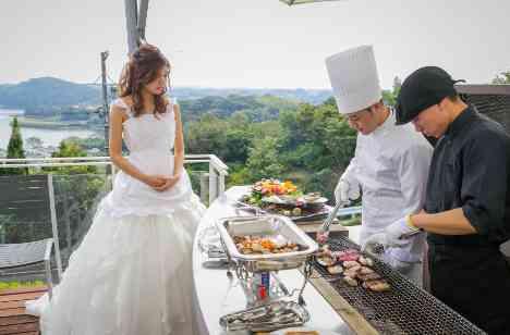 そして、パーティ後半は・・・ ザ・マルシェ【浜名湖オーシャンBBQ】! おふたりがおもてなしするこのスタイル。 ゲストの目の前で新鮮な魚介やお肉を楽しんでいただきました。 絶景も味のひとつ。 他では味わえない、特別な“おもてなし”。