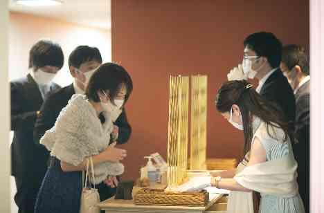 挙式前にスタッフがゲスト全員消毒、マスク着用の徹底など、感染症対策はしっかりと行いました。ソーシャルディスタンスを保つため、間隔を取って座ってもらいました。ゲストの皆さまからの温かい祝福に、とても幸せな気持ちになられたようです!