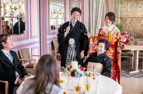 和装も合う会場で、料理とスイーツを楽しむ結婚式