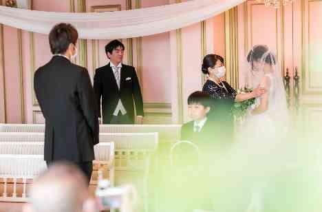 360度湖に囲まれる絶景の中、家族だけの感動の挙式を!チャペルでの人前式では、お父様と入場後、お母様へバトンタッチしていただきベールダウンへ。その後、家族と共にゆっくりとバージンロードをお進みいただきました。家族だけの挙式だからこそ叶う、贅沢な時間と幸せに包まれる空間でした。