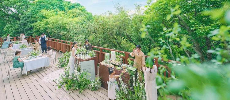 - 緑あふれる広々としたウッドデッキは、多彩な演出が叶う特別な空間です。貸切ならではの贅沢なプライベート感の中で、ゲストとともに心安らぐひとときをお過ごしいただけます。自然のぬくもりに包まれた空間は、晴れの日はもちろん、雨天時でも安心してご利用いただける全天候型。デザートビュッフェやオリジナル演出も楽しめ、ふたりらしいおもてなしが実現します。大切な方々とともに、思い出に残る温かな時間をお過ごしください