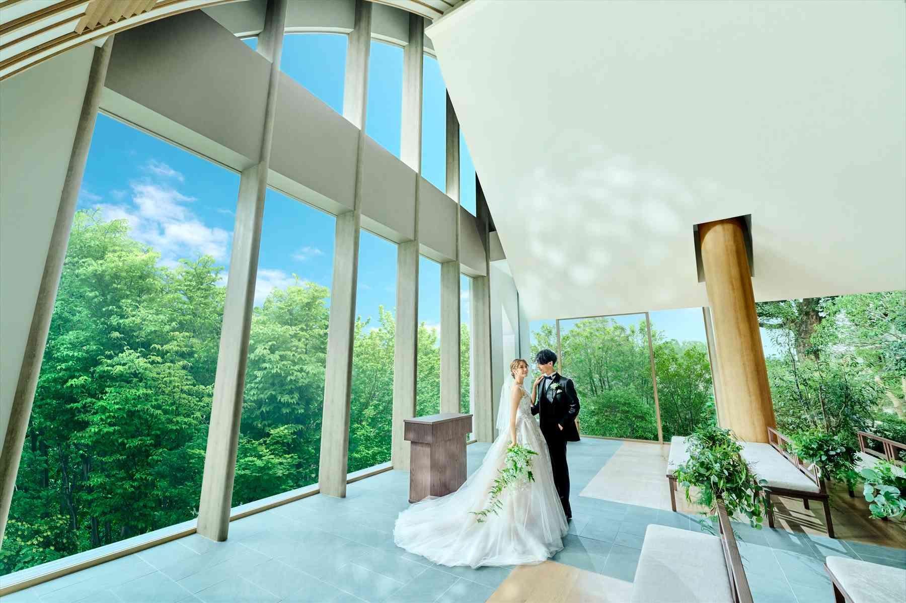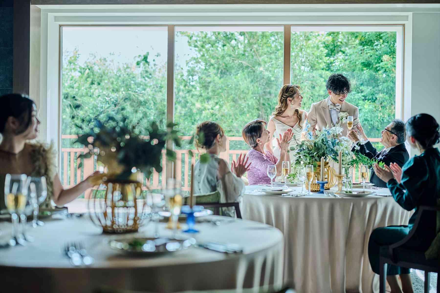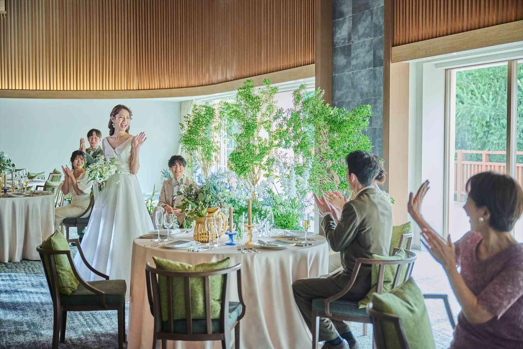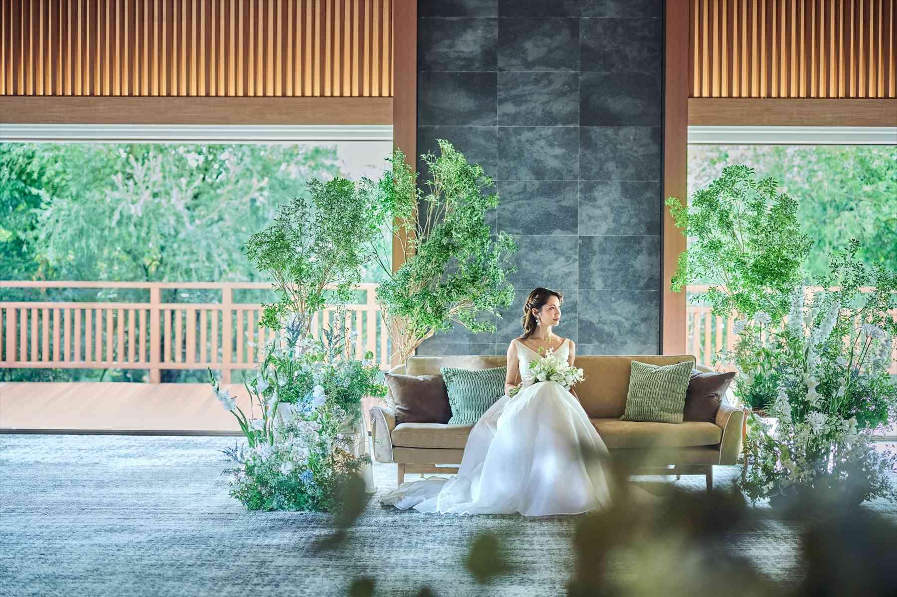 自然素材を活かした全天候型バンケットでは、ゲストに「寛ぎ」を提供。窓一面に広がる鮮やかな緑が、ナチュラルなウェディングパーティを演出し心に残るひとときを。〈ご利用人数:2〜140名〉