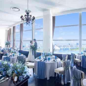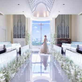 おふたりの姿や表情から感謝の思いや覚悟が全員の心へと繋がり、 感動と祝福で一体になる特別な空間です。 花嫁の美しさが引き立つ純白の世界と背景に広がる東京湾の青が花嫁をより引き立たせます。