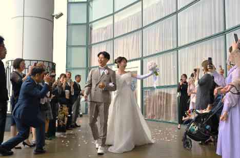 挙式後はお台場のロケーションが広がるテラスでのフラワーシャワーへ。海風がそよぐ中ゲストの皆様からの祝福の花びらが舞い、おふたりの笑顔を一層華やかに彩ります。ゲストの方々の「おめでとう!」の声とともに笑顔があふれ、まるで映画のワンシーンのような時間に。お台場ならではの開放感と非日常の景色が、祝福の瞬間をより特別なものにしてくれました。