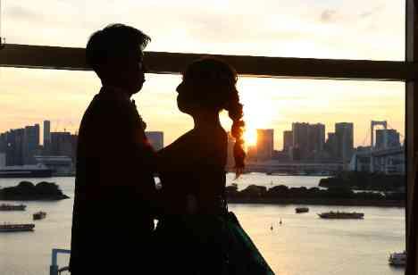披露宴の後半には会場の窓から美しい夕日が差し込み始め、特別な撮影タイムへ。オレンジ色に染まる空とお台場ならではのロケーションが重なり合い、映画のワンシーンのようなロマンチックな光景に。やわらかい光に包まれたおふたりのシルエットは一日の感動と余韻を静かに閉じ込めたような心残るワンショットとなりました。