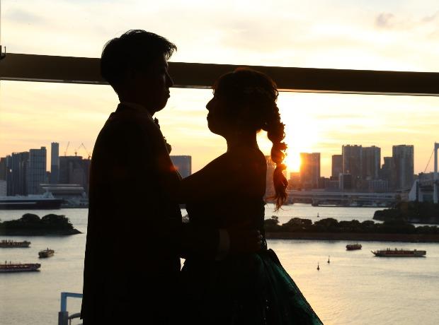 披露宴の後半には会場の窓から美しい夕日が差し込み始め、特別な撮影タイムへ。オレンジ色に染まる空とお台場ならではのロケーションが重なり合い、映画のワンシーンのようなロマンチックな光景に。やわらかい光に包まれたおふたりのシルエットは一日の感動と余韻を静かに閉じ込めたような心残るワンショットとなりました。