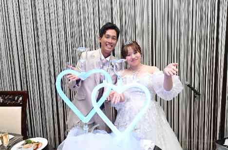 ご披露宴ではおなかの中の赤ちゃんの性別あてクイズジェンダーリビールの演出を。ふたつあるハートのうちひとつにはご新郎様の予想の色を、そしてご新婦様はもうひとつのハートに正解の色のアクアを注いで完成。予想と正解にわくわくしながらゲストの皆様が見守ります。正解が明らかになった瞬間、驚きと歓喜、そして笑顔が一気に広がり、ゲストの皆様と喜びを分かち合う温かな時間となりました。