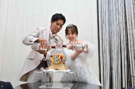 ウエディングケーキセレモニーの代わりに行われたのは、おふたりならではのフルーツ酒のセレモニー。フルーツいっぱいのボトルにおふたりで一緒に、お酒を注いでフルーツ酒の完成!そしておふたりからゲストの皆様へ1杯振る舞う、ゲストの皆様への感謝の気持ちが込められた演出へ。会話が弾み和やかなひとときとなりました。