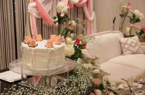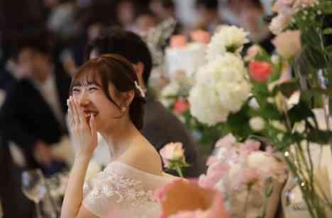 ウェディングケーキはかわいらしいピンクのチューリップをモチーフにしたオリジナルデザイン。専属のパティシエの手によって繊細に再現されたお花のデザインが目を引き、登場した瞬間にゲストからの歓声が上がりました。おふたりのこだわりが詰まったケーキは、会場全体をより華やかに彩る存在に。幸せな空気に包まれながら行われたケーキセレモニーは笑顔あふれるひとときとなりました。