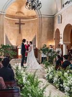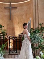 【教会演出】一歩ごとに想いが重なるバージンロード演出が人気。光と花に包まれながら、一歩一歩を未来へと歩み出す特別な瞬間を光の演出で表す。光と音が響き合う心揺さぶるシーンは特別。光に包まれて誓う神聖で温かな祝福の光が花嫁を照らす。