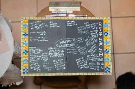 黒板ボードにたくさんの“おめでとう”が並ぶ、世界にひとつだけの寄せ書き。黒板に綴られた手書きのメッセージには、新郎新婦を想うたくさんの愛と祝福が込められています。一文字一文字に笑顔が浮かぶような、心のこもった寄せ書き。おふたりの新しい門出を見守るように並ぶ言葉の数々が、幸せな思い出として永遠に残ります。