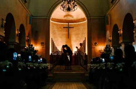 温かな灯りに包まれたチャペルで交わす誓いの瞬間。まるで映画のワンシーンのように、二人のシルエットが浮かび上がる幻想的な瞬間。ゲスト全員の視線が一つになり、永遠の愛を見届ける感動的なセレモニーです。静寂の中に心が震えるような、神聖な時間が流れます。祝福に満ちた空間で、心がひとつになるフォトジェニックなシーンです。