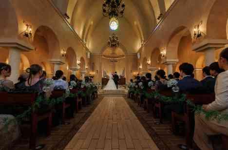 南フランスの教会建築をモチーフにした温もりある大聖堂。オレンジがかった壁と高い天井に灯るシャンデリアの光が、厳かな中にもあたたかさを感じさせます。天然の大理石が輝くバージンロードを歩む花嫁の姿に、ゲストから感動の視線が集まる瞬間。キャンドルの灯りと音楽に包まれた、心が温まるようなセレモニーシーンです。