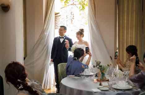 ガーデンの扉を開けると、あたたかな光に包まれた会場へ。カーテンをくぐって登場した新郎新婦の笑顔に、ゲストから歓声とシャッターの音が響きます。ナチュラルな光と柔らかな色合いが、南フランスの邸宅を思わせる温かな雰囲気。笑顔と祝福に満ちた瞬間が、会場全体を優しく包み込みます。おふたりらしさが光る、心温まる入場シーンです。