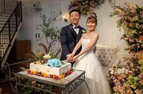笑顔がこぼれるケーキ入刀のワンシーン。華やかなフラワーデコレーションに囲まれたメイン席で、ふたりが息を合わせてナイフを入れる瞬間、会場中から歓声とシャッター音が響きます。ナチュラルな色合いと花の香りに包まれた空間は、まるで南フランスの邸宅のよう。ゲストと共に過ごすあたたかな祝福の時間が、この日をいっそう特別なものにしています。