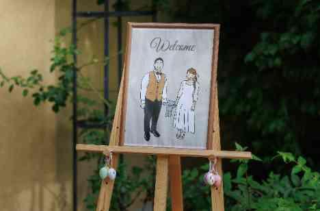 木製のイーゼルに飾られた、手描き風の新郎新婦イラストが描かれたウェルカムボード。やわらかなタッチとナチュラルな色合いが、訪れるゲストを優しく迎えます。背景には緑とアイボリーの壁が広がり、南フランスの街角を思わせるあたたかな雰囲気。おふたりらしい世界観が伝わるこの一枚が、特別な一日の始まりを穏やかに彩ります。