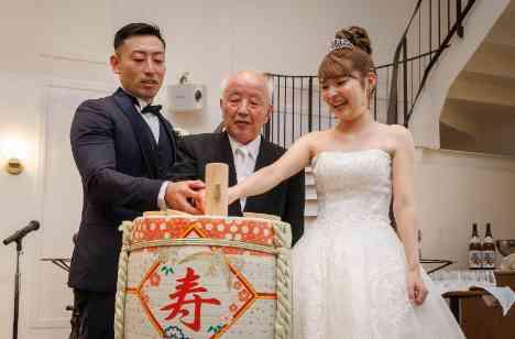 披露宴の乾杯は、絶対におじいちゃんに!と強く希望されていました。もともと結婚式では地酒を用意したいと言っていた新郎新婦へ鏡開きでの乾杯をご提案。 結婚式におふたりが用意したのは新郎様の名前と同じ漢字の地酒でした。 お祖父様からの「よいしょ、よいしょ、よいしょ」の掛け声で楽しいパーティーのスタート!