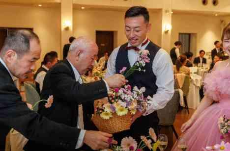 新婦様が大好きでこだわったのが会場装花やブーケ。 お花を使った演出の希望と、ゲスト一人ひとりと写真撮影やお話ができる時間を取りたいという2つの希望を合わせて、ゲストの皆様からお花を1輪ずつ集める演出を開催しました。 思い思いにゲストの方がフラワーを選び、ふたりのカゴ一杯にお花を集めて、素敵な花束が完成致しました!