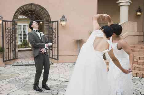 支度を仕上げ、緊張した面持ちで待っている新郎様 肩を「トントン」と叩かれ後ろを振り向くと、そこには.... 新郎様と大の仲良しのご友人の姿が!状況を理解し思わず大きな笑い声が響きます きっとド緊張をしているだろうという新郎様に、新婦様から粋なサプライズ! ご友人のおかげで新郎様の緊張もほぐれ、素敵なファーストミートになりました! サプライズ大成功! 大成功♪