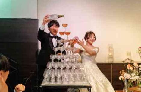 写真映えも抜群のシャンパンタワー。ゲストの掛け声と拍手に包まれながら、ふたりで息を合わせて注ぎます。グラスに注がれるたびに歓声がわき上がり、会場の一体感は最高潮に。キラキラ輝くシャンパンとはじける笑顔がパーティーをさらに華やかに彩ります。シャンパンがグラスを満たしたら、ゲストの皆様と一緒に乾杯です。