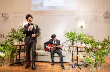 披露宴では、新婦の弟様と新郎によるギターの弾き語りが披露されました。息の合った演奏と心のこもった歌声に、会場は温かな空気に包まれます。新郎新婦への想いが込められた特別なステージに、ゲストの皆さまもうっとりと聞き入っていました。家族と新郎が一緒に作り上げた心温まる余興は、会場全体に感動と笑顔を届けてくれました。